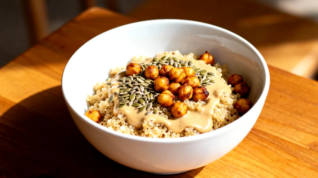 Nach einem intensiven Training sehnt sich der Körper nach einer Mahlzeit, die sowohl sättigt als auch optimal bei der Regeneration unterstützt. Eine Quinoa-Bowl mit Hanfsamen und gerösteten Kichererbsen liefert genau diese perfekte Kombination aus hochwertigen Proteinen, gesunden Fetten und komplexen Kohlenhydraten – und das vollständig pflanzlich.